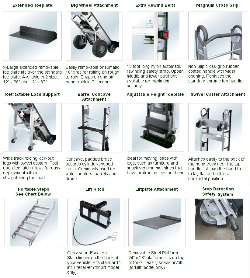 The Escalera Motorized Stair Climber (Removable) - MLA-EW with battery operated winch for raising and lowering the forks which side frames made from tough tempered aluminum alloy and alos have steel lift frames, with 28 inch long forks, for raising loads up to 54 inches - high enough to load or unload a semi truck! All Escalera Forklifts have a 1200 pound maximum capacity. 2 different models, the removable winch/lift model and the non-removable model. And then there is an option of a hand cranked lift or an electric winch lift.