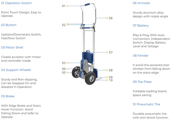 XSTO's Heavy Duty Stair Climber model ZW7200G features a 440 lbs capacity designed for transfer awkward cargo up and down stairs with just a single operator. It can carry printers, home appliances, furniture and other goods without any effort and can help you save huge labor costs. Solid tires ,brake system, Intensive Aluminum alloy frame, simple touch button control ,rechargeable battery ,higher load make it more and more popular. This model is made suitable for construction material handling, beverage handling and cargo delivery.