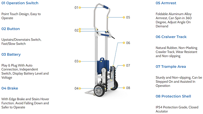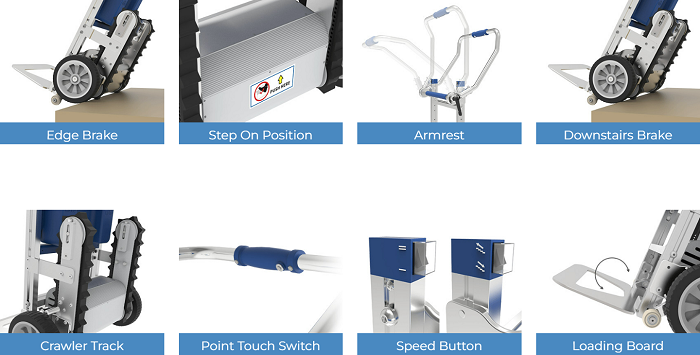 This Electric Foldable Stair Climbing Hand Truck is a revolutionary motorized stair climbing dolly which can carry up to 230 lbs worth of cargo on stairs easily.It features a unique non-marking rubber crawler track which offers additional safety and security when going up and down the stairs.